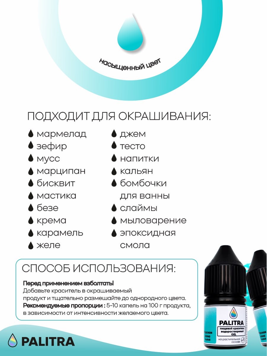 Состав: вода; красители Е133, Е102; Влагоудерживающий агент (Пищ.глицерин); антиокислитель (лим. кислота); Консервант (сорбат калия) Краситель пищевой гелевый водорастворимый PALITRA отлично подходят для кулинарных экспериментов, а также для создания слаймов, бомбочек для ванны и мыла ручной работы. Благодаря гелевой консистенции, краситель PALITRA легко и равномерно распределяется в массе, обеспечивая насыщенный и однородный цвет. Он не влияет на структуру продукта, не разжижает его и не меняет вкусовые качества. Это особенно важно при работе с деликатными кремами и тестом, где консистенция играет ключевую роль. Красители обладают высокой концентрацией, поэтому для достижения желаемого оттенка требуется совсем небольшое количество. Это делает их экономичными и позволяет избежать излишней влажности в продукте. -Мерный носик флакона обеспечивает точную дозировку, что особенно важно при создании сложных цветовых композиций. -Широкая палитра цветов позволяет реализовать любые творческие идеи. От нежных пастельных оттенков до ярких и насыщенных цветов – возможности безграничны. Экспериментируйте, смешивайте, создавайте свои уникальные цветовые решения, чтобы ваши кулинарные шедевры и творческие проекты стали неповторимыми. Помимо пищевого применения, красители PALITRA идеально подходят для создания мыла ручной работы, слаймов и бомбочек для ванн. Они придают изделиям яркий и стойкий цвет, который не выцветает со временем. Благодаря своей безопасности и нетоксичности, красители можно использовать даже для детского творчества. Рекомендованная дозировка: 6-15 капель(0,10-0,30 г) на 100 г продукта (перед применением флакон тщательно взболтать). НА РАСТИТЕЛЬНОЙ ОСНОВЕ! НЕ СОДЕРЖИТ ПРОПИЛЕНГЛИГОЛЬ! Красители PALITRA – это универсальный инструмент для воплощения ваших творческих и кулинарных фантазий. Они просты в использовании, безопасны и обеспечивают превосходный результат. Создавайте яркие и запоминающиеся проекты с PALITRA !