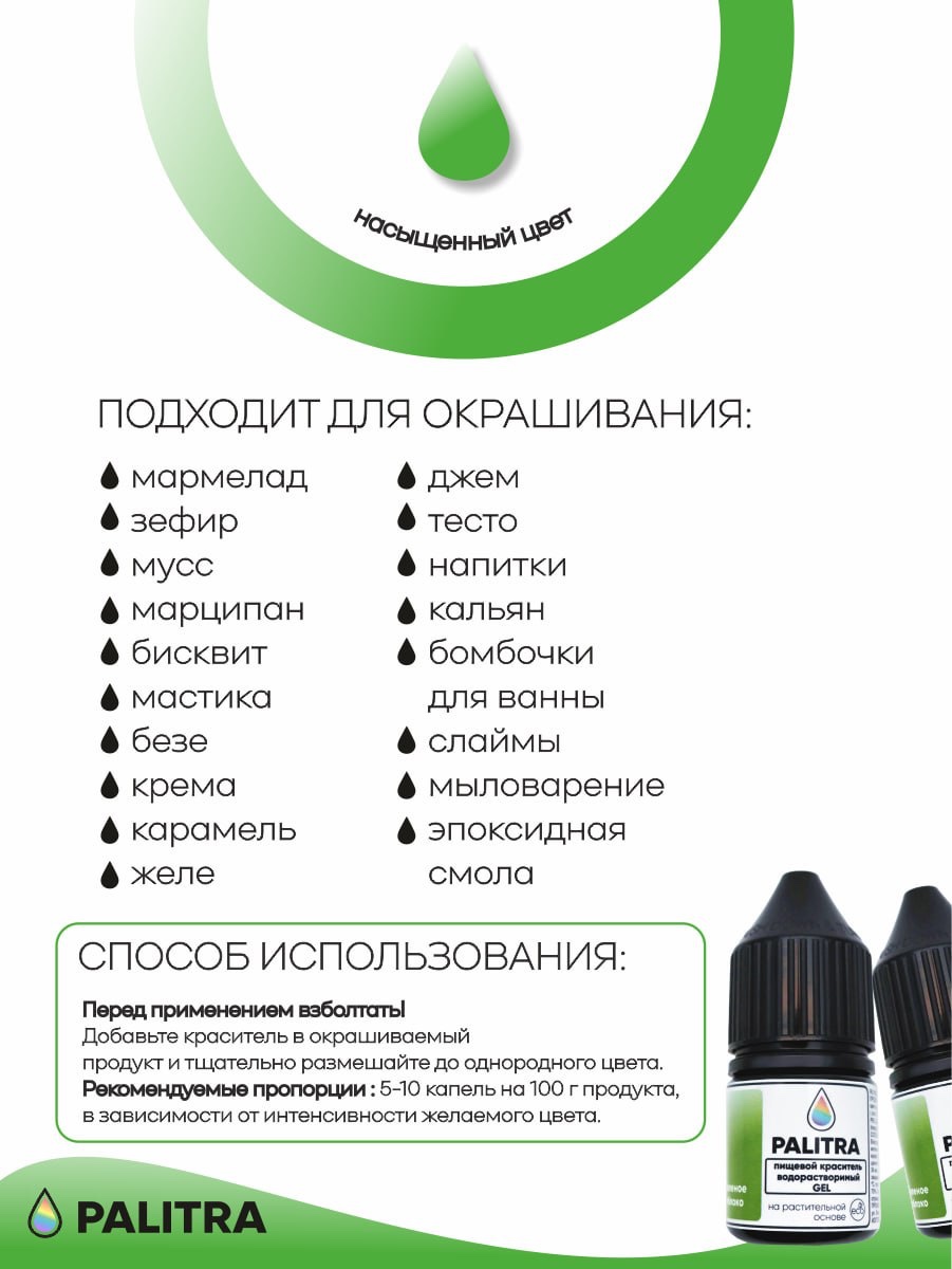 Состав: вода; красители Е133, Е102; Влагоудерживающий агент (Пищ.глицерин); антиокислитель (лим. кислота); Консервант (сорбат калия) Краситель пищевой гелевый водорастворимый PALITRA отлично подходят для кулинарных экспериментов, а также для создания слаймов, бомбочек для ванны и мыла ручной работы. Благодаря гелевой консистенции, краситель PALITRA легко и равномерно распределяется в массе, обеспечивая насыщенный и однородный цвет. Он не влияет на структуру продукта, не разжижает его и не меняет вкусовые качества. Это особенно важно при работе с деликатными кремами и тестом, где консистенция играет ключевую роль. Красители обладают высокой концентрацией, поэтому для достижения желаемого оттенка требуется совсем небольшое количество. Это делает их экономичными и позволяет избежать излишней влажности в продукте. -Мерный носик флакона обеспечивает точную дозировку, что особенно важно при создании сложных цветовых композиций. -Широкая палитра цветов позволяет реализовать любые творческие идеи. От нежных пастельных оттенков до ярких и насыщенных цветов – возможности безграничны. Экспериментируйте, смешивайте, создавайте свои уникальные цветовые решения, чтобы ваши кулинарные шедевры и творческие проекты стали неповторимыми. Помимо пищевого применения, красители PALITRA идеально подходят для создания мыла ручной работы, слаймов и бомбочек для ванн. Они придают изделиям яркий и стойкий цвет, который не выцветает со временем. Благодаря своей безопасности и нетоксичности, красители можно использовать даже для детского творчества. Рекомендованная дозировка: 6-15 капель(0,10-0,30 г) на 100 г продукта (перед применением флакон тщательно взболтать). НА РАСТИТЕЛЬНОЙ ОСНОВЕ! НЕ СОДЕРЖИТ ПРОПИЛЕНГЛИГОЛЬ! Красители PALITRA – это универсальный инструмент для воплощения ваших творческих и кулинарных фантазий. Они просты в использовании, безопасны и обеспечивают превосходный результат. Создавайте яркие и запоминающиеся проекты с PALITRA !